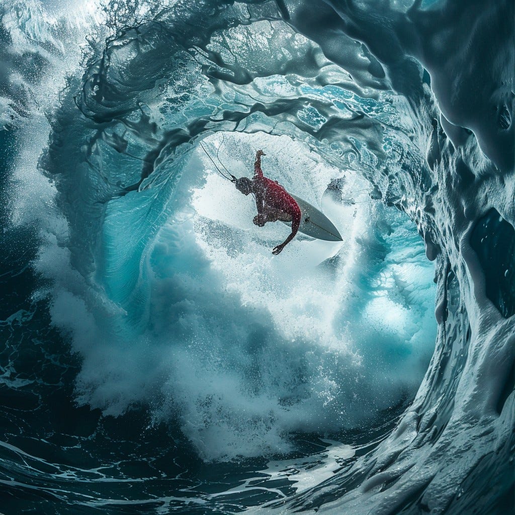 On the horizon, a gorgeous right was forming. He felt butterflies in his stomach as it took shape. He paddled in, turned, and caught it. His body hummed, electric. The wave was double overhead at least. He dropped into it and skittered down the face. The thick lip cracked behind him as it broke. He leaned into the wave, put his hand on the surface to balance, and buried himself deep in the barrel.